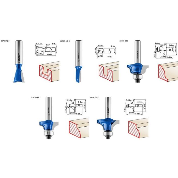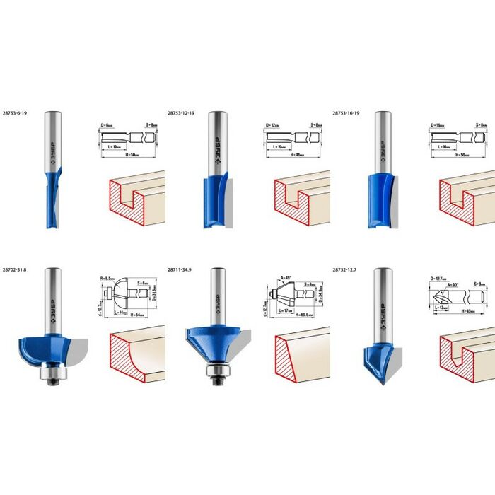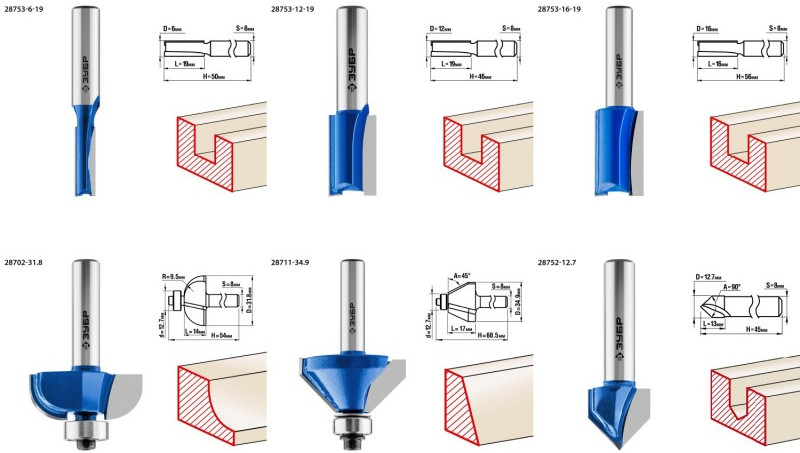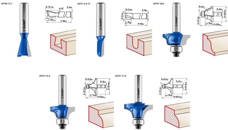 Набор фрез отлично подходит для профилирования кромок, изготовления декоративных пазов и рисунков, фрезерования канавок при работе с различными видами древесины.