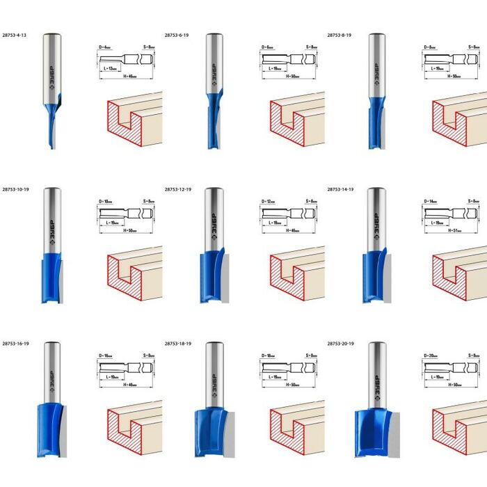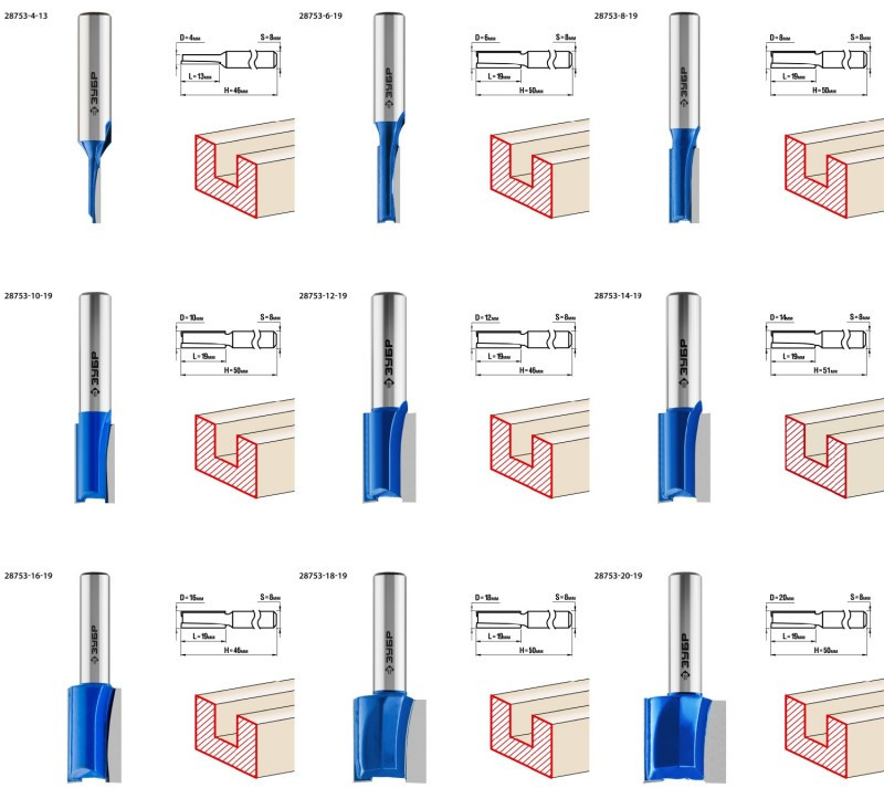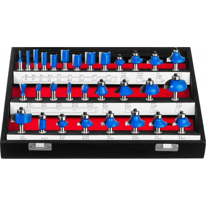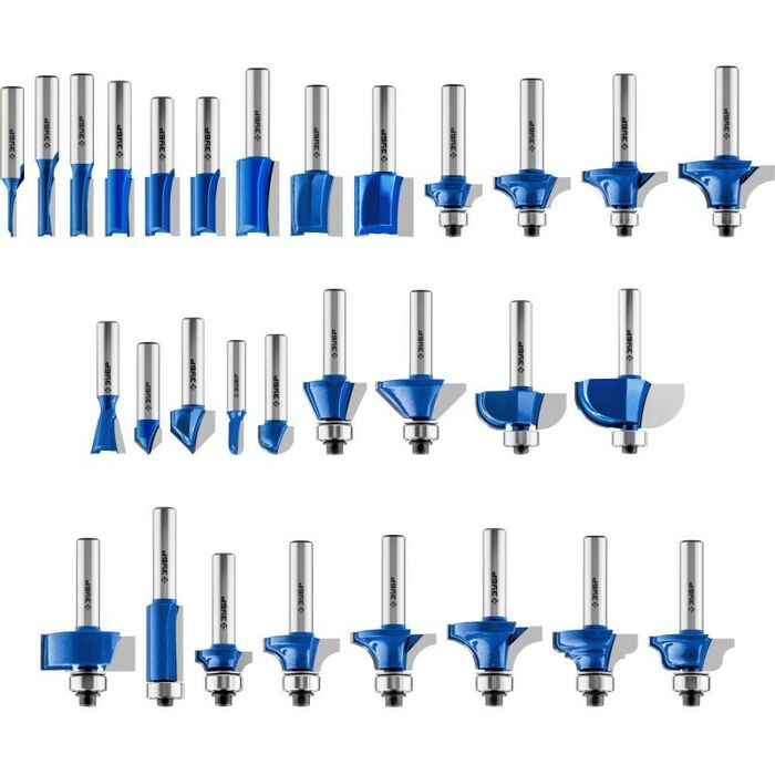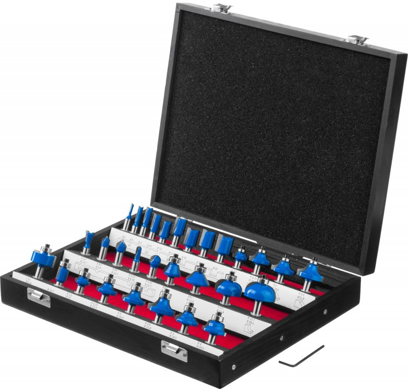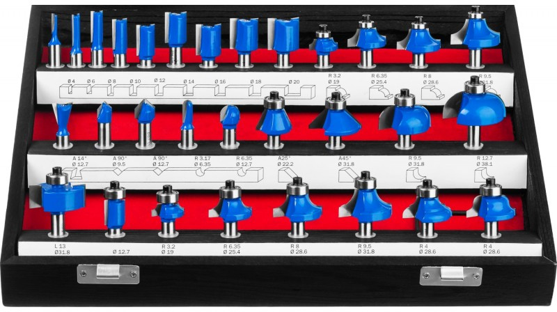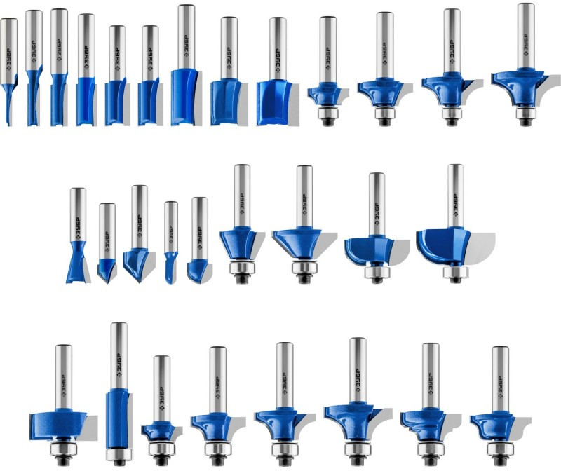 - Набор фрез отлично подходит для профилирования кромок, изготовления декоративных пазов и рисунков, фрезерования канавок при работе с различными видами древесины.