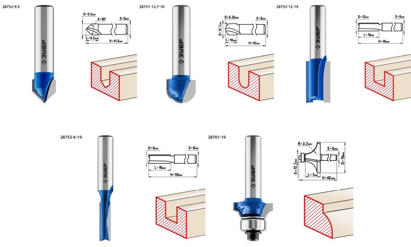 Набор фрез отлично подходит для профилирования кромок, изготовления декоративных пазов и рисунков, фрезерования канавок при работе с различными видами древесины.