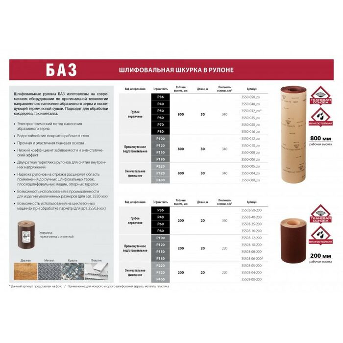 Рулон шлифовальный БАЗ KK19XW M40 (Р400) 775 мм, на тканевой основе, водостойкий, 30 м [3550-00-775]