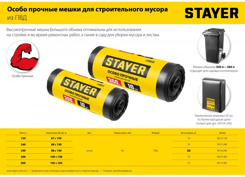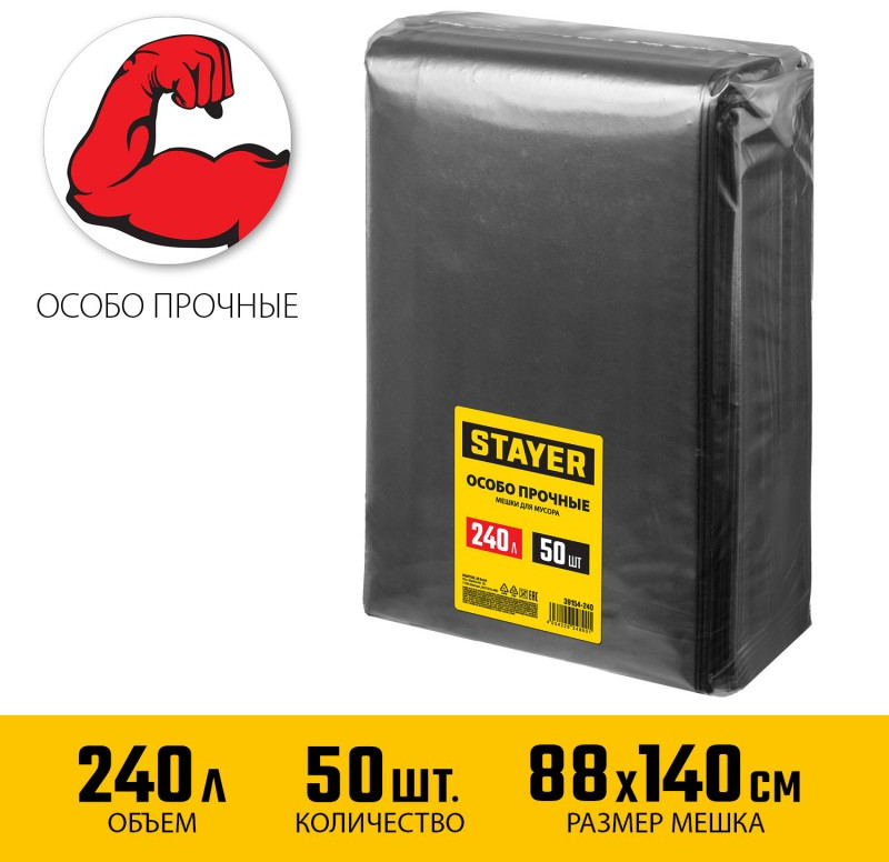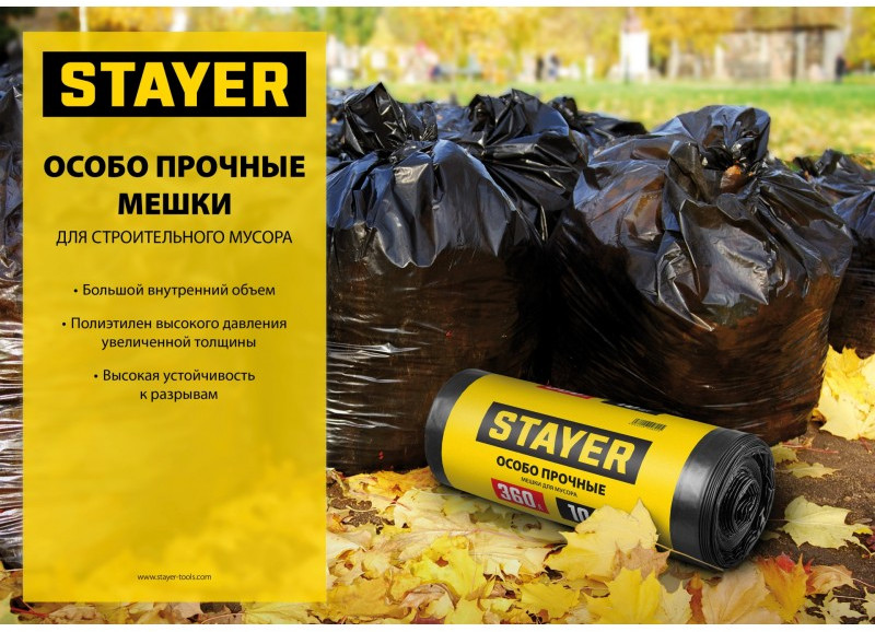 Мусорные мешки STAYER предназначены для сбора, временного хранения и утилизации мусора. Благодаря увеличенной толщине обладают высокой прочностью, надежностью и устойчивостью к разрывам.