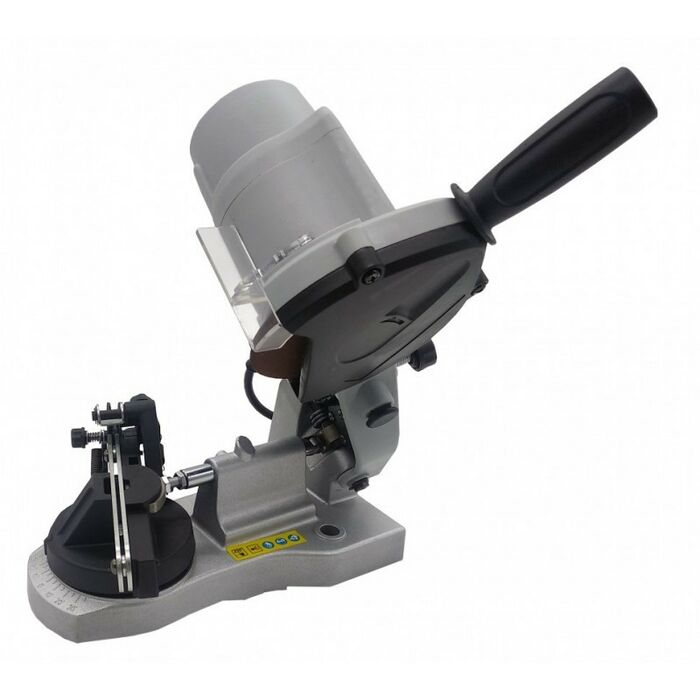 - Безопасная эксплуатация. Щиток из прозрачного пластика защищает оператора от искр, вылетающих в процессе эксплуатации станка для заточки цепей.