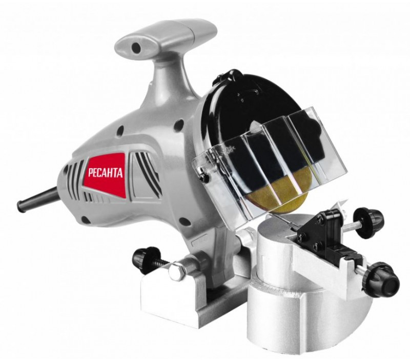 - Безопасная эксплуатация. Щиток из прозрачного пластика защищает оператора от искр, вылетающих в процессе эксплуатации станка для заточки цепей