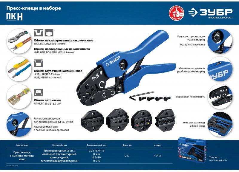 Набор пресс-клещи Зубр Профессионал ПК-Н 5 матриц, в кейсе [45455]