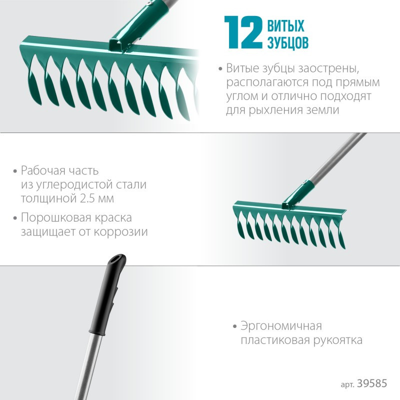 - Витые зубцы хорошо удерживают сухой мусор на рабочей поверхности.