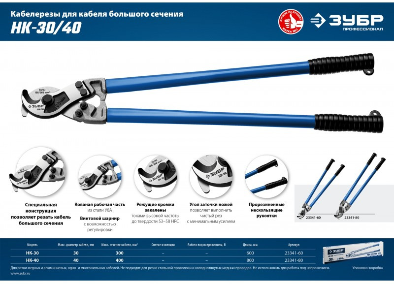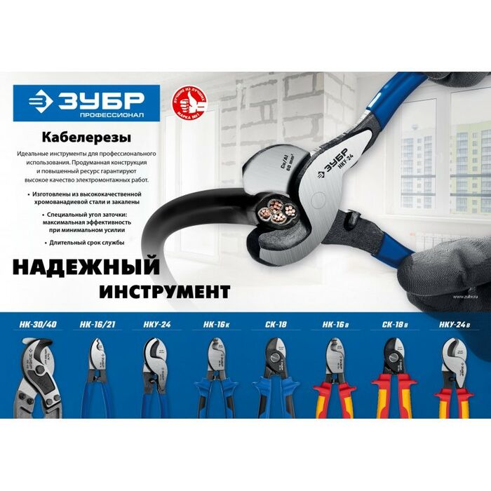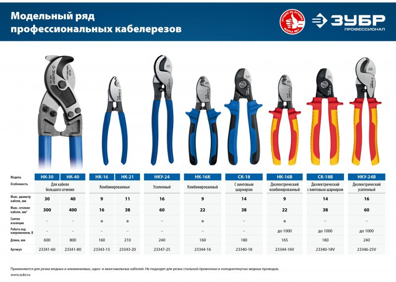 - Кабелерезы ЗУБР изготовлены из высококачественной стали, предназначены для профессионального применения. Обладает повышенным ресурсом, обеспечивает высокое качество электромонтажных работ.