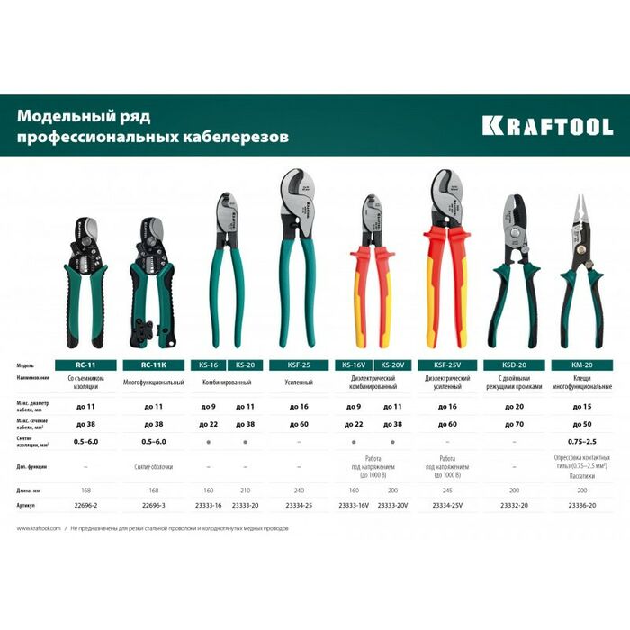 Применяется для удаления изоляции и обрезки кабеля. Не прикладывайте ударных нагрузок. Не использовать для работы под напряжением. Не предназначены для резки стальной проволоки и холоднотянутых медных проводов