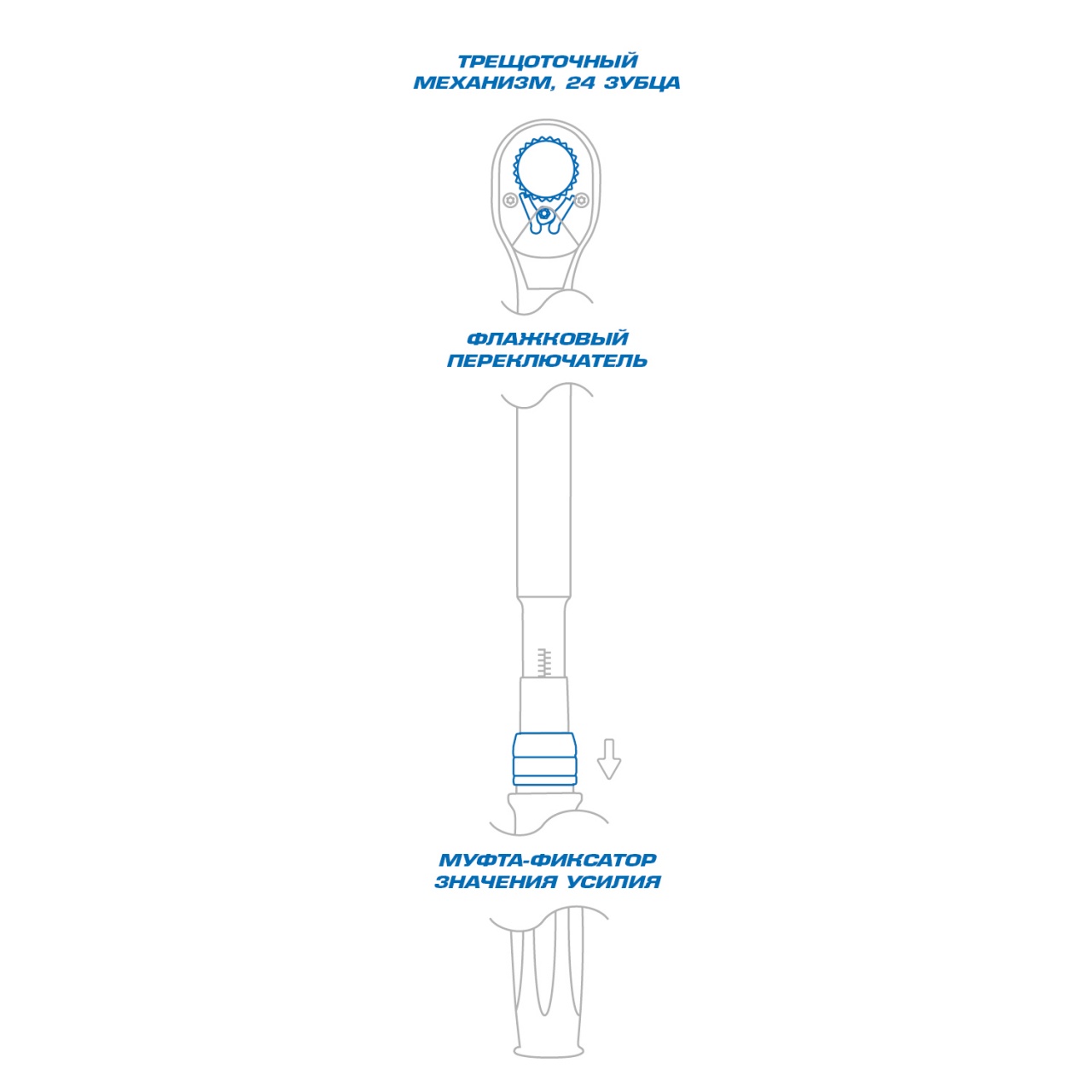 • Механизм фиксации установленного значения срабатывания ключа исключает случайный проворот рукоятки