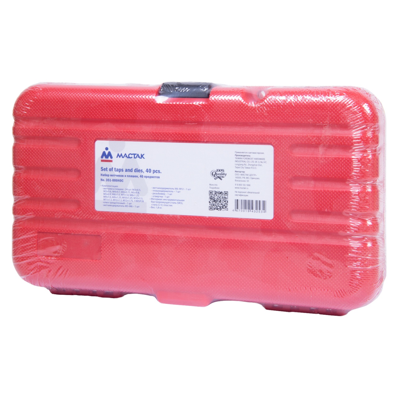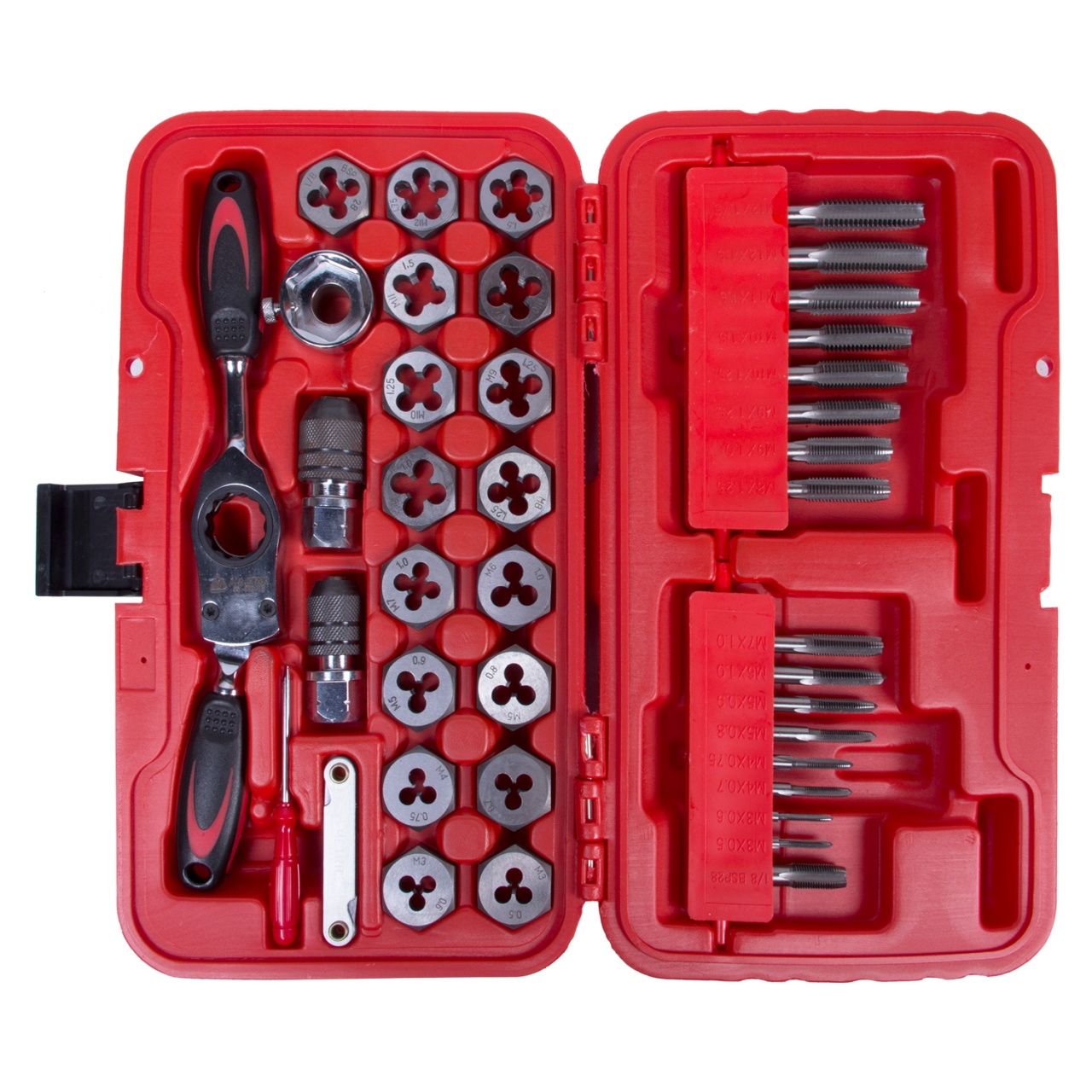 • Метчики и плашки - 34 шт: M3×0.5, M3×0.6, M4×0.7,M4×0.75, M5×0.8,M5×0.9, M6×1.0,M7×1.0,M8×1.25,M9×1.0, M9×1.25, M10×1.25,M10×1.5, M11×1.5, M12×1.5, M12×1.75, 1/8BSP28.
