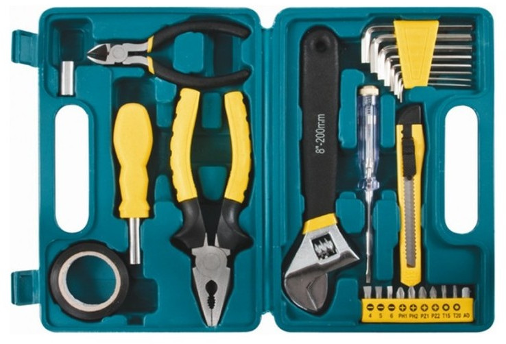 - В наборе: пассатижи (165 мм), ключ разводной (200 мм), отвертка индикаторная, бокорезы мини (115 мм), переходник с воротка 1/4 на биту, переходник с биты на головку 1/4, отвертка с магнитным фиксатором бит, 8 ключей HEX (1.5, 2.0, 2.5, 3.0, 4.0, 5.0, 5.5, 6.0 мм), 9 бит - 25 мм (SL4, SL5, SL6, PH1, PH2, PZ1, PZ2, T15, T20), лента изоляционная, нож технический (9 мм)