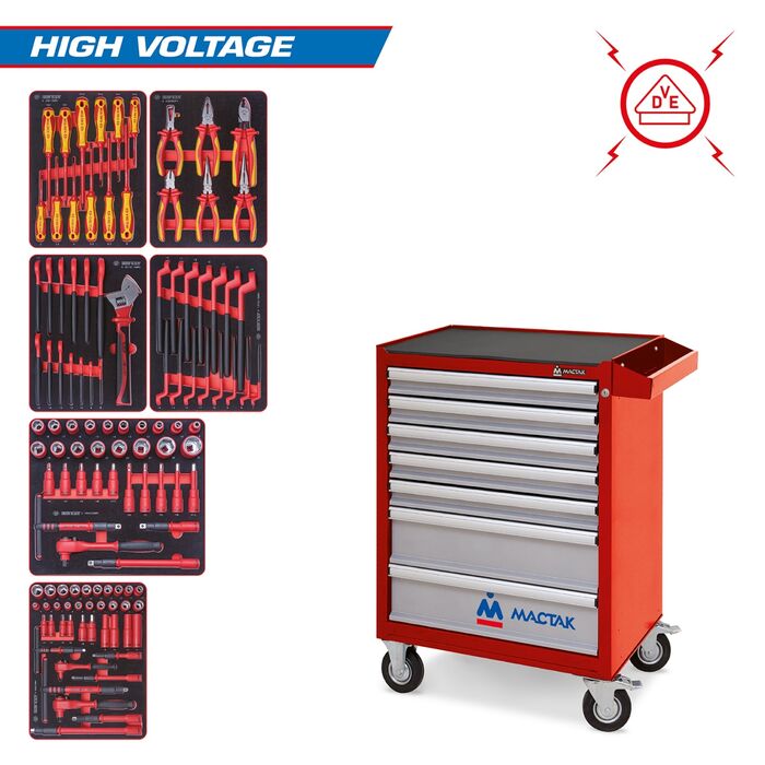 Материалы – сталь Cr-V, сталь SNCM+V, хром, PP (изоляция), вспененный PVC (рукоятки ключей), PP+TPR (рукоятки отверток, трещоток, шарнирно-губцевого инструмента), EVA