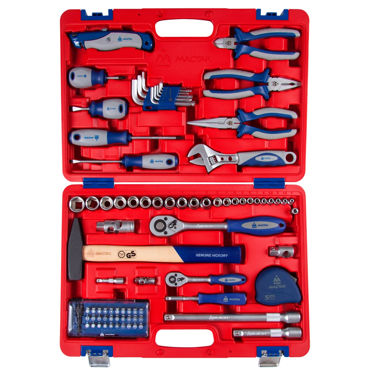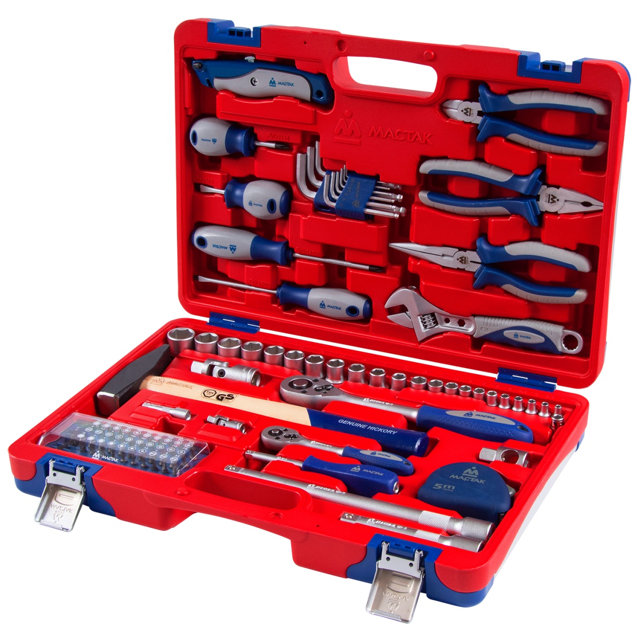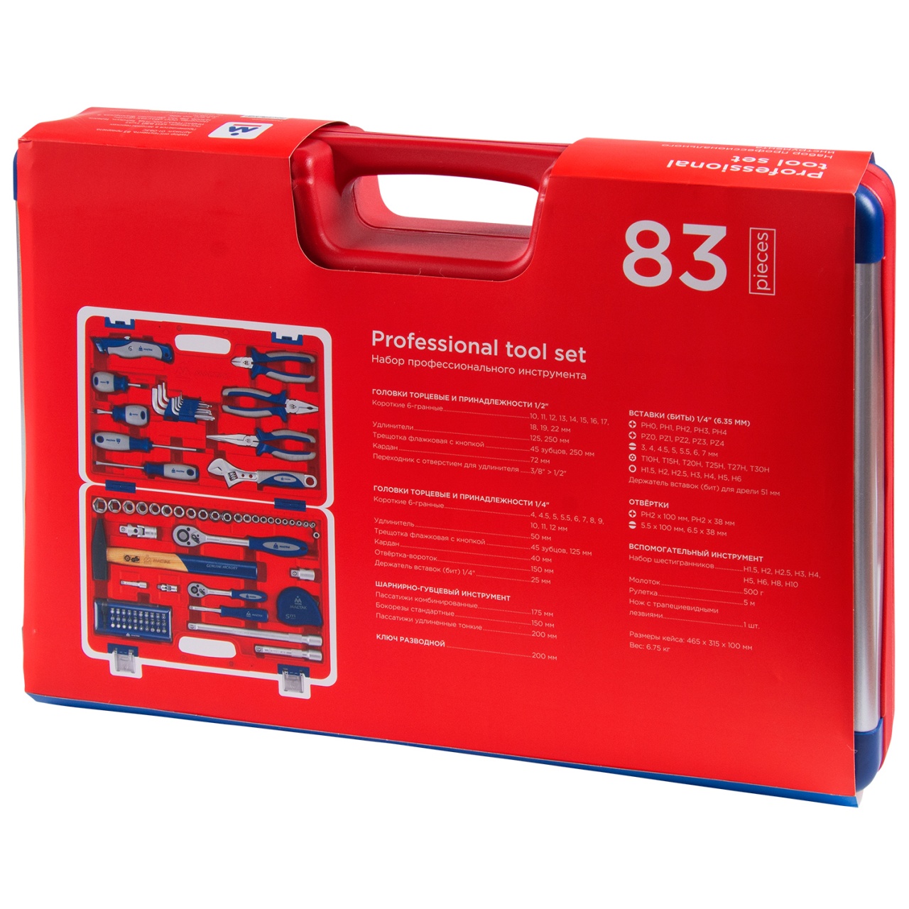Материалы – сталь Cr-V, сталь SNCM+V (S2), конструкционная сталь, хром, пластик PP, PP+TPR (рукояти), дерево (рукоять молотка), пластик PE-HD (кейс), пластик ABS (декоративные накладки кейса)