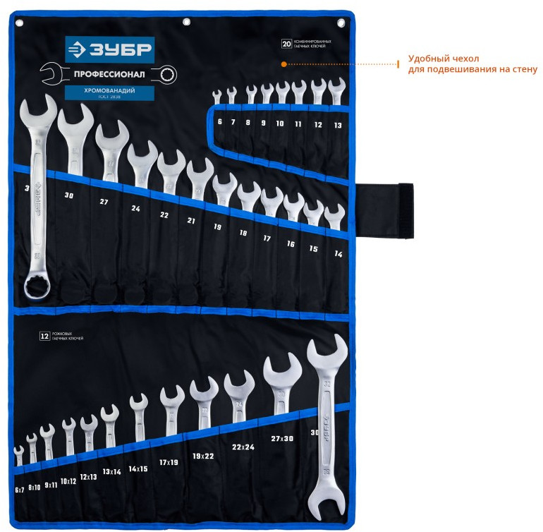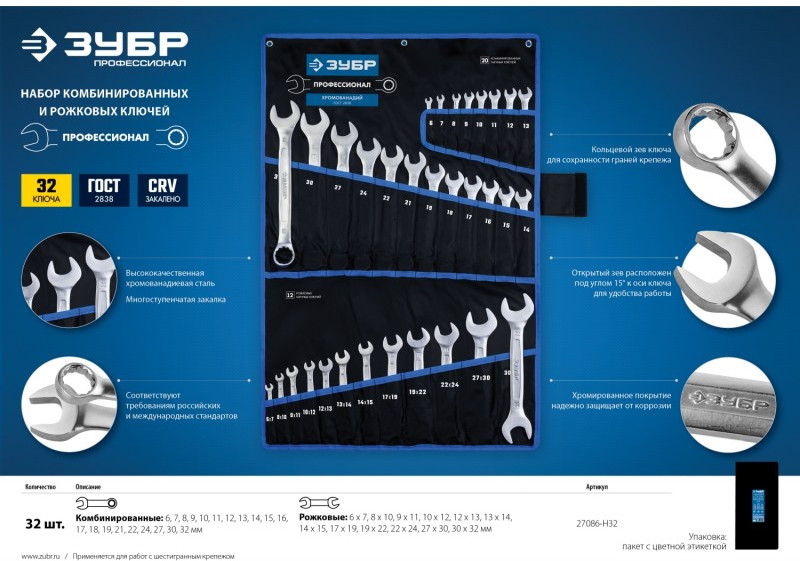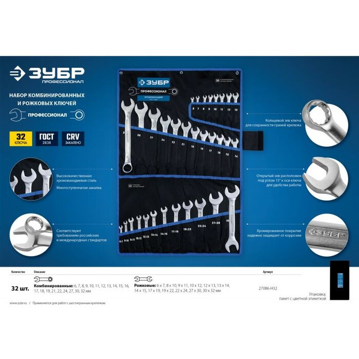 Набор комбинированных и рожковых гаечных ключей Зубр 27086-H32 32 шт, 6 - 32 мм