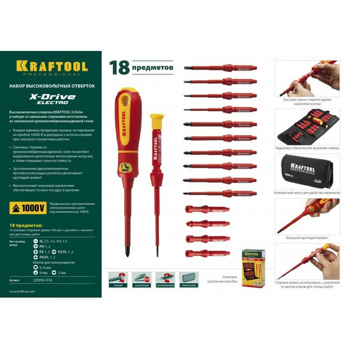 Набор KRAFTOOL Х-Drive ELECTRO высоковольтные отвертки, сменные стержни, ключи специальные, до 1000В, 18 предметов [220092-H18]