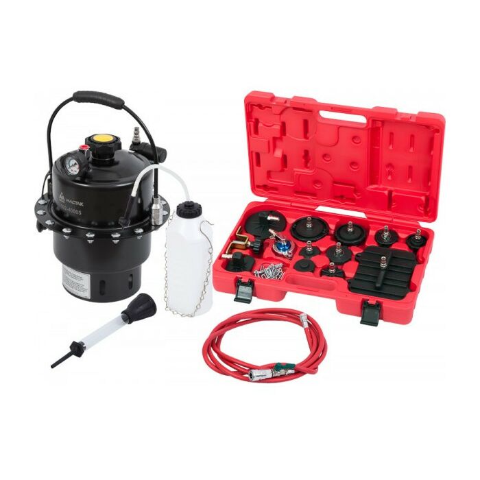 Набор приспособлений для замены тормозной жидкости, состоящий из 15 предметов.