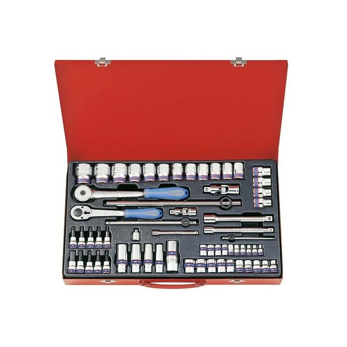 Набор торцевых головок с принадлежностями, состоящий из 62 предметов.