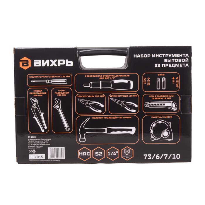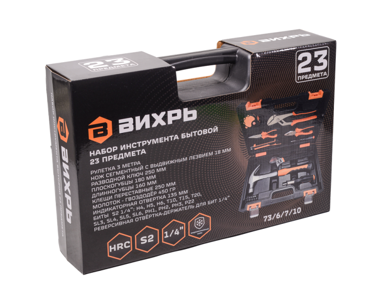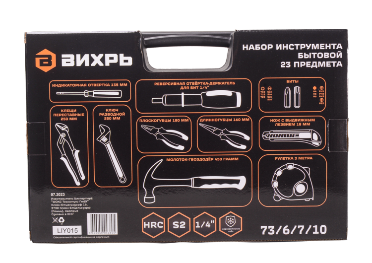 Рулетка, длинногубцы, нож с выдвижным лезвием, клещи переставные, плоскогубцы, индикаторная отвёртка, молоток-гвоздодёр, разводный ключ, реверсивная отвёртка-держатель для бит 1/4", биты S2 1/4"