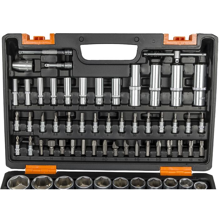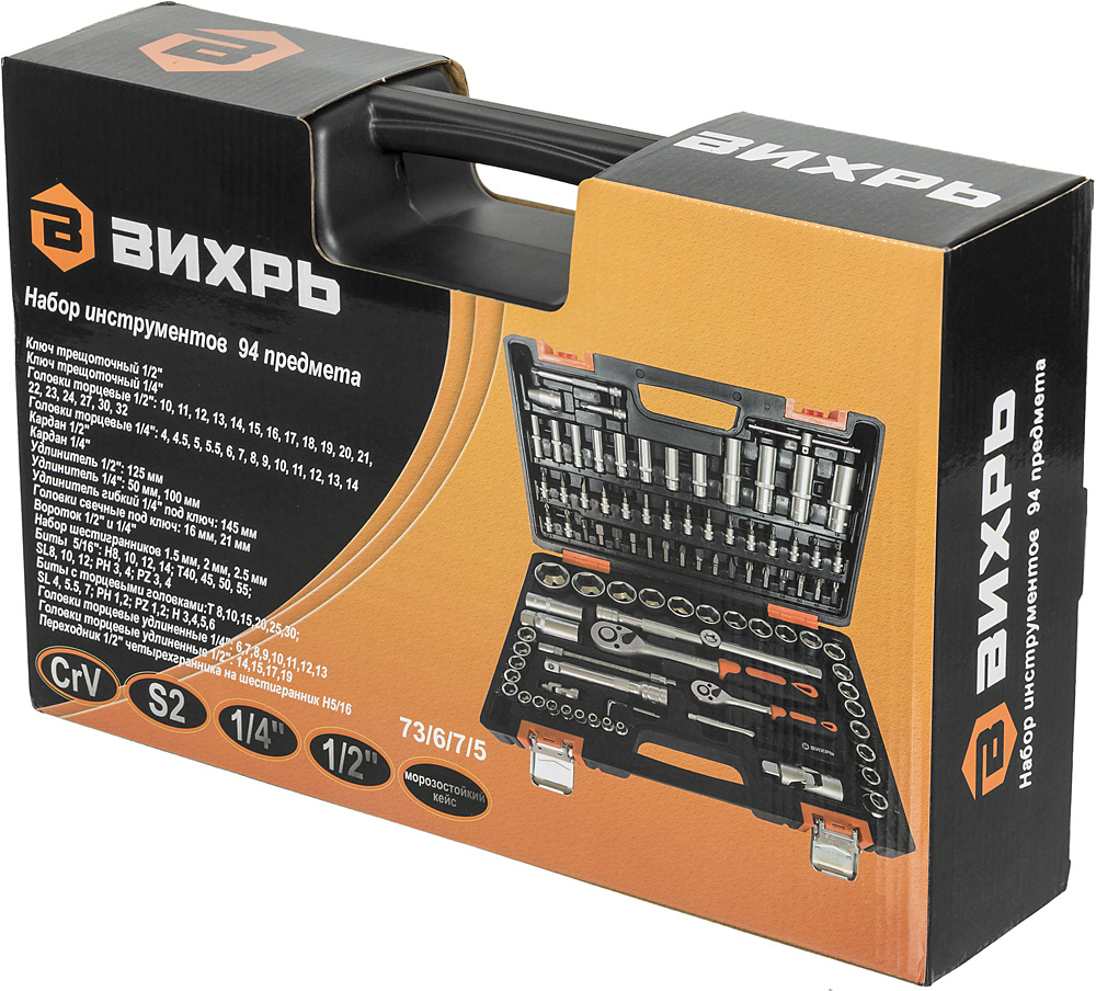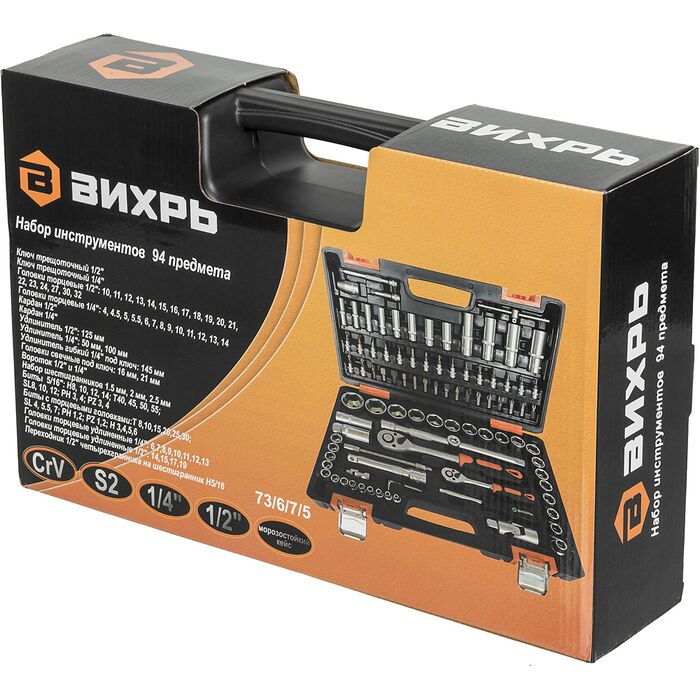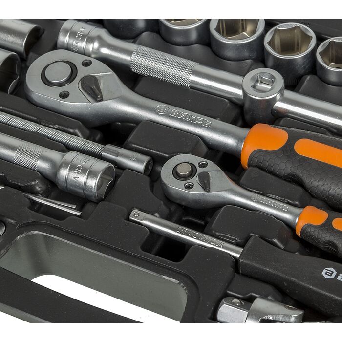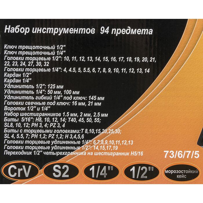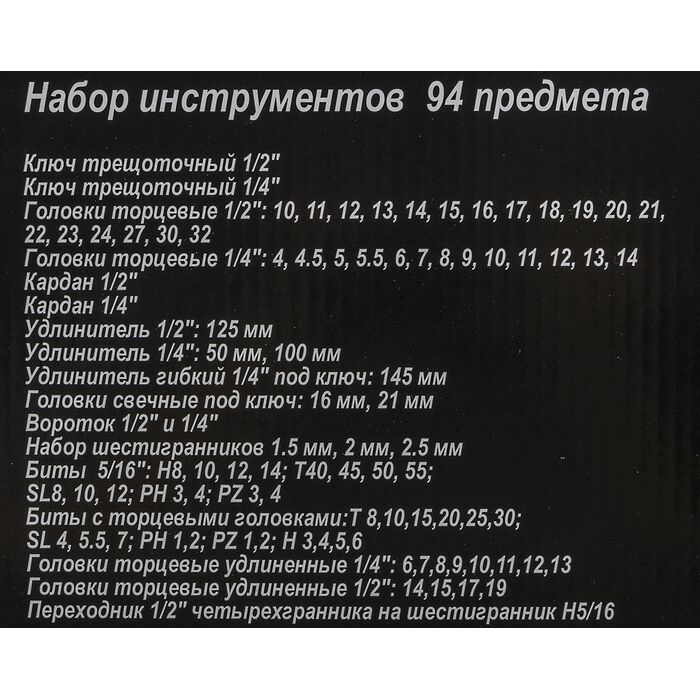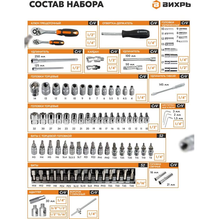 | Дополнительно в наборе, 1 / 4"DR | Удлинители 50, 100 мм, гибкий 145 ммадаптер, вороток Т-образный, карданный шарнир, отверточная рукоятка |