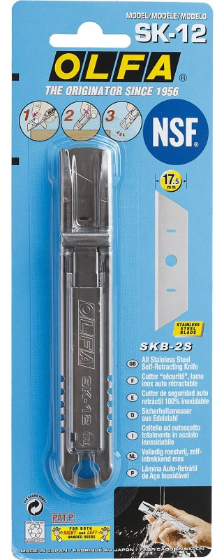 Нож OLFA SK-12 специально разработан для применения в пищевой промышленности и ресторанном бизнесе. Сертифицирован NSF благодаря возможности легко поддерживать его в чистоте любыми методами и составами, в том числе дезинфекция гипохлоритом натрия, за счет конструкции и лезвию SKB-2S из нержавеющей стали. Также, нержавеющая сталь обладает высоким коэффициентом намагничивания, что обеспечивает ножу более высокую точность нахождения металлодетекторами, чем у обычных ножей с пластиковыми рукоятками.