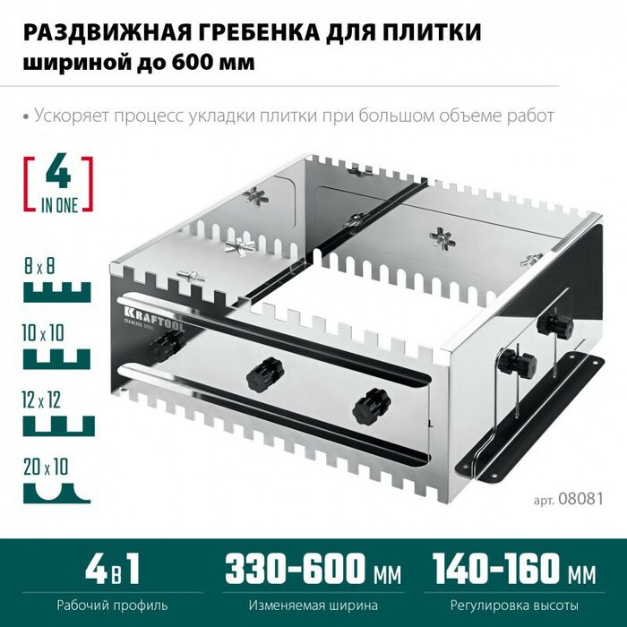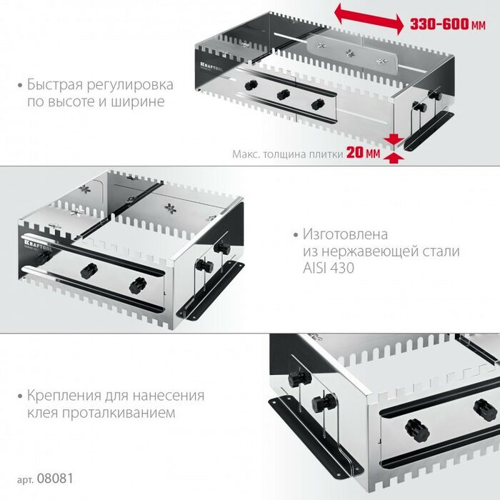 Имеет 4 рабочих профиля с величиной зубьев 8, 10, 12 и 14мм для универсального подхода к любым задачам. Боковые регуляторы помогут закрепить гребенку на рабочей поверхности и настроить её по высоте под любую плитку. Легко моется, не боится влаги.