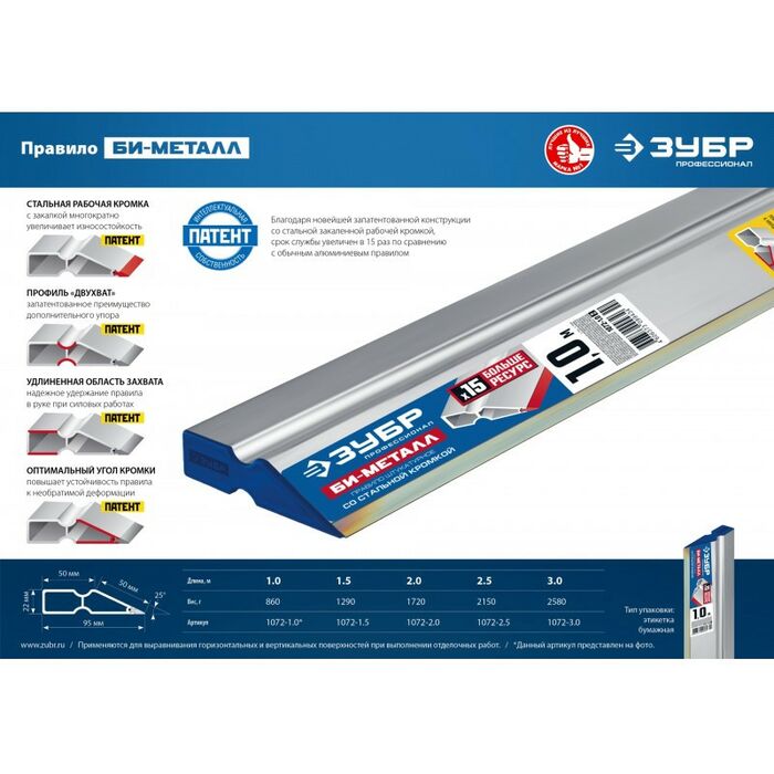 - Благодаря новейшей запатентованной конструкции со стальной закаленной рабочей кромкой, срок службы увеличен в 15 раз по сравнению с обычным алюминиевым правилом