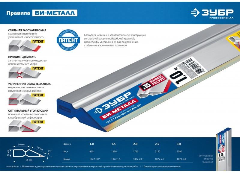 Благодаря новейшей запатентованной конструкции со стальной закаленной рабочей кромкой, срок службы увеличен в 15 раз по сравнению с обычным алюминиевым правилом