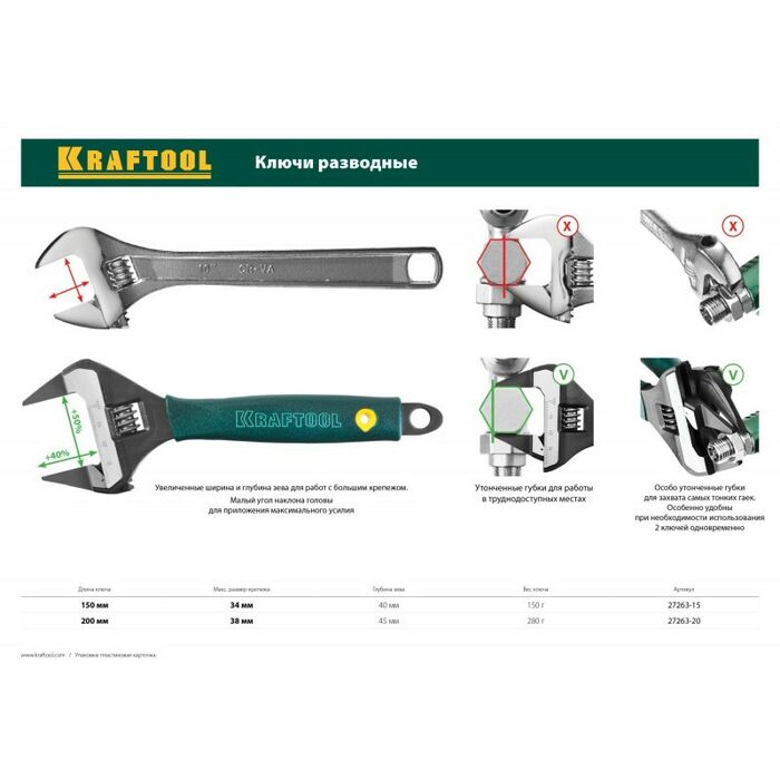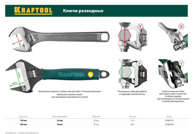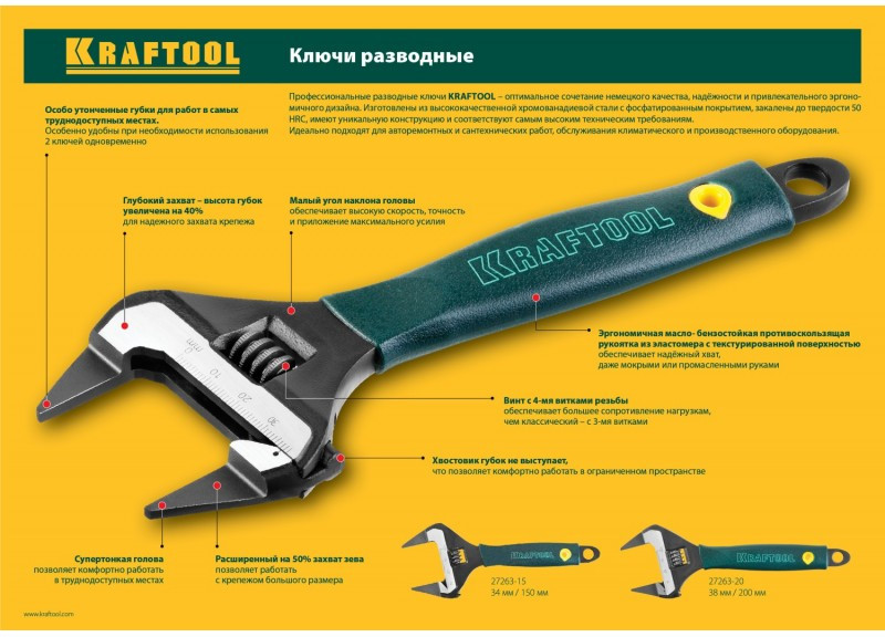 - Профессиональные разводные ключи Kraftool изготовлены из высококачественной хромованадиевой стали, соответствуют самым высоким техническим требованиям, фосфатированное покрытие защищает от коррозии. Обладают повышенным ресурсом и обеспечивают длительную и качественную работу при монтаже и демонтаже резьбовых соединений.