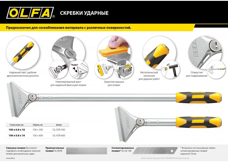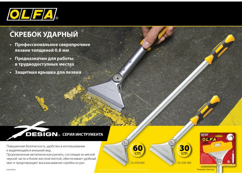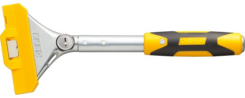 Скребок OLFA - повышенная безопасность, удобство в использовании и выделяющийся внешний вид. Прорезиненная металлическая рукоять, состоящая из мягкой черной части и более жесткой желтой, обеспечивает удобный хват и предотвращает выскальзывание скребка из рук.