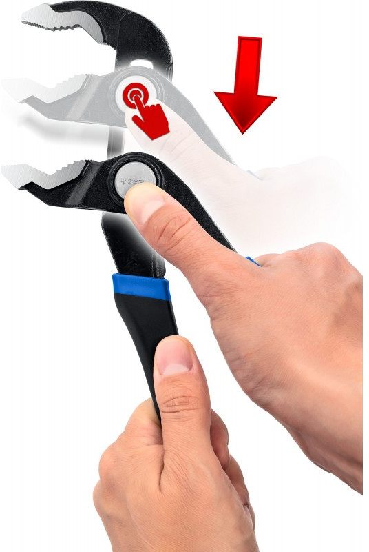 • Уникальная конструкция шарнира с кнопочным фиксатором обеспечивает быстрый подбор ширины зева.
