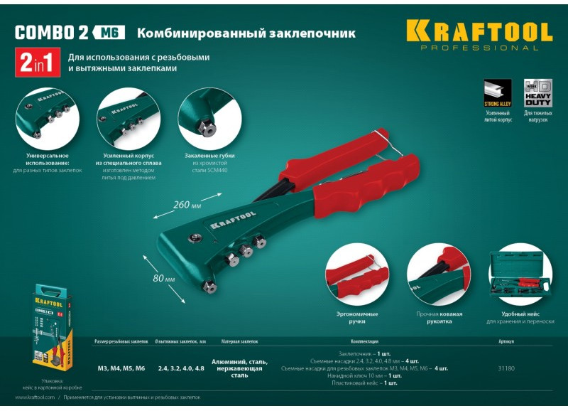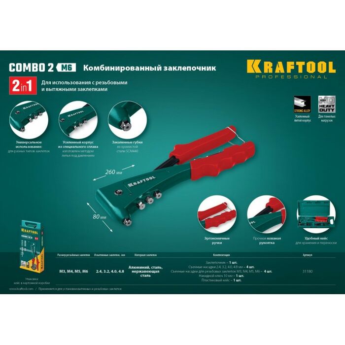 • Комбинированный заклепочник KRAFTOOL выдерживает высокие рабочие нагрузки и предназначен для установки резьбовых и вытяжных заклепок из алюминия, стали и нержавеющей стали.