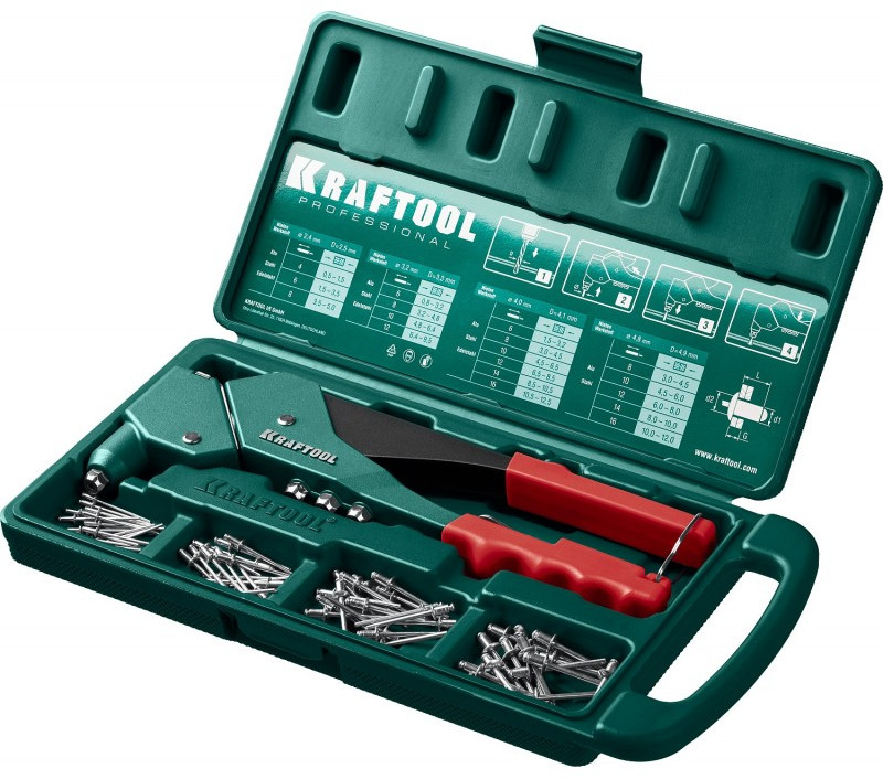Заклепочник KRAFTOOL выдерживает высокие рабочие нагрузки и предназначен для установки заклепок из алюминия, стали и нержавеющей стали различных диаметров согласно таблице.