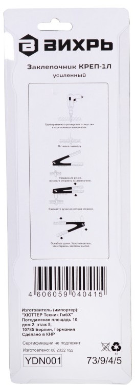 Заклепочник Вихрь КРЕП-1Л усиленный, 2.4-4.8 (типы заклепок: сталь/алюминий/нержавеющая сталь, размеры заклепок: 2.4, 3.2, 4.0, 4.8