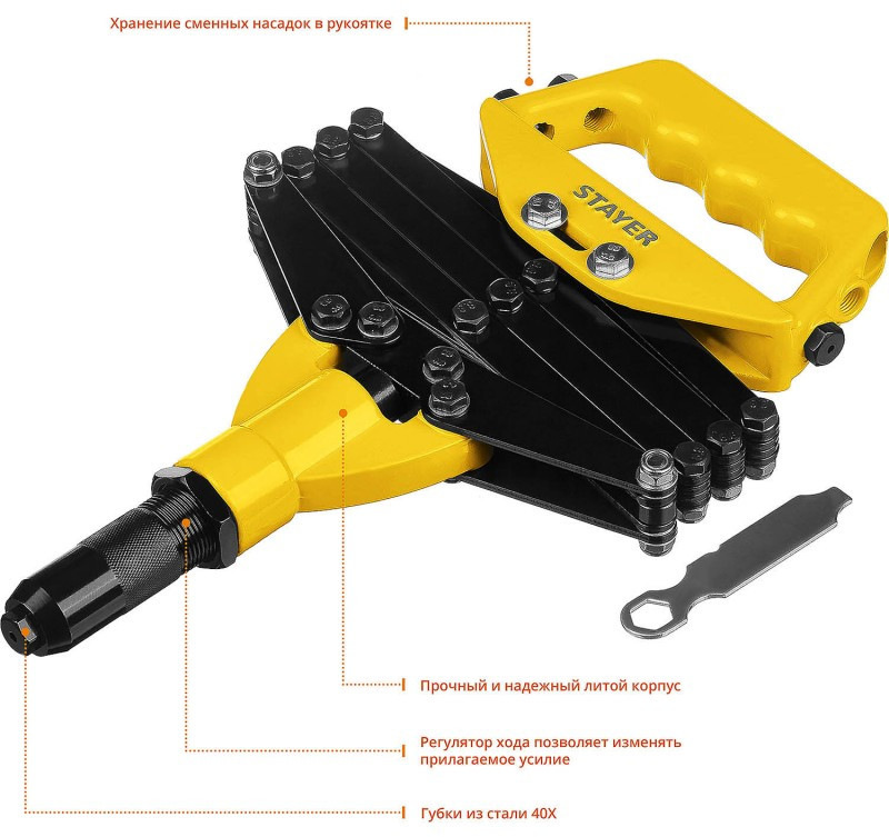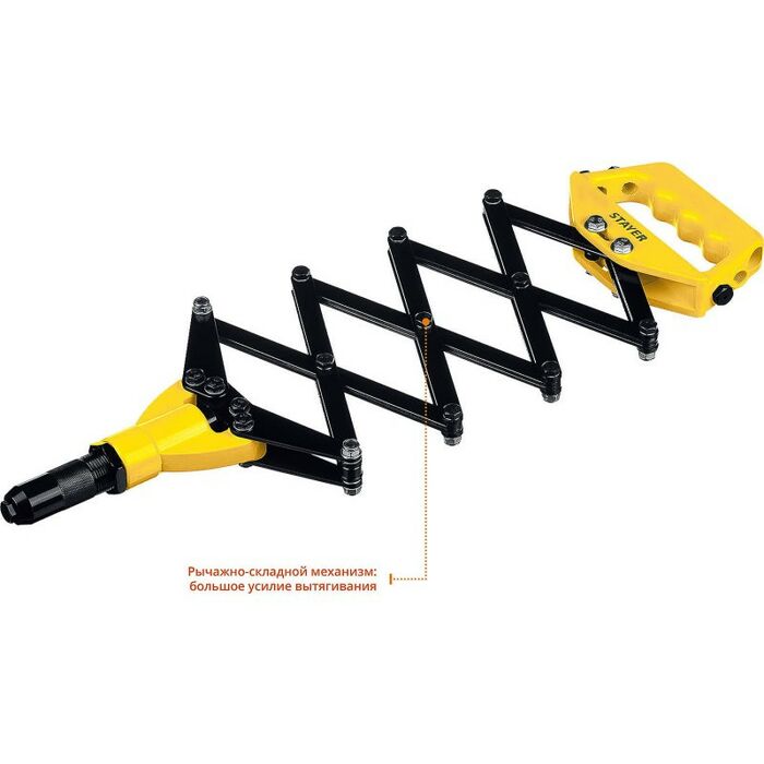 Профессиональный рычажно-складной заклепочник Stayer серии PROFESSIONAL облегчает работу в труднодоступных местах, а усиленная конструкция корпуса значительно увеличивает срок службы инструмента.