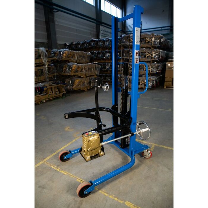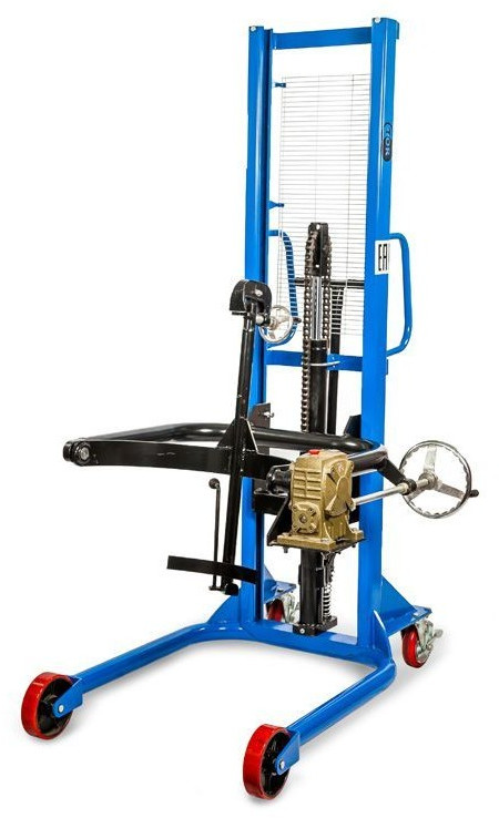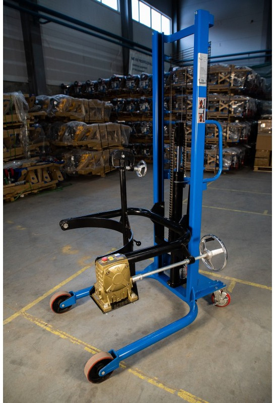 Специальный штабелер, сделанный для поднятия, перевозки и кантования (наклона, переворота) бочек. Модель оснащена надежным держателем бочек и червячным ручным редуктором для переворота бочки. Штабелер простой в обращении и не прихотлив в обслуживании. Максимальный вес бочки может быть 350 кг, что в принципе покрывает практически все материалы, тарированные в бочки. К минусам данной модели можно отнести лишь то, что бочку брать и ставить мы можем только с ровных площадок: пол, полки. С помощью этого штабелера не получиться работать с бочками с паллет. Высота подъема в 2.0 метра позволяет ставить бочки в 2 яруса.
