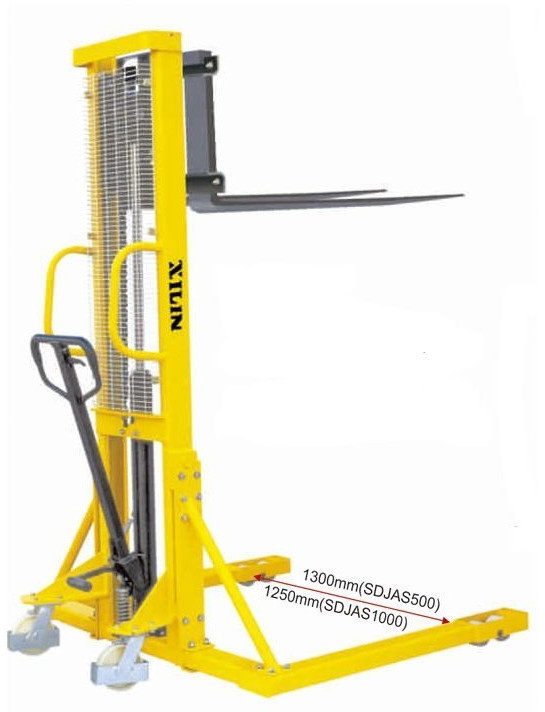 Ручные штабелеры марки Xilin зарекомендовали себя только с хорошей стороны. В модельном ряду найдутся как экономичные модели, так и модели для интенсивных нагрузок. Ручной штабелер XILIN SDJAS500/1000/1500 — Серия ручных штабелеров с расширенными опорами. Благодаря такой компоновке опор штабелер более устойчив и вдобавок у него вилы опускаются ниже, так как они опускаются между опор, а не на них и поэтому высота подхвата составляет 70 мм, при обычной для штабелеров высоте подхвата 85-90 мм. Данная модель обладает грузоподъемность 1000 кг и высотой подъема 1,6 метра.
