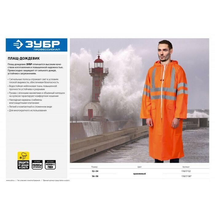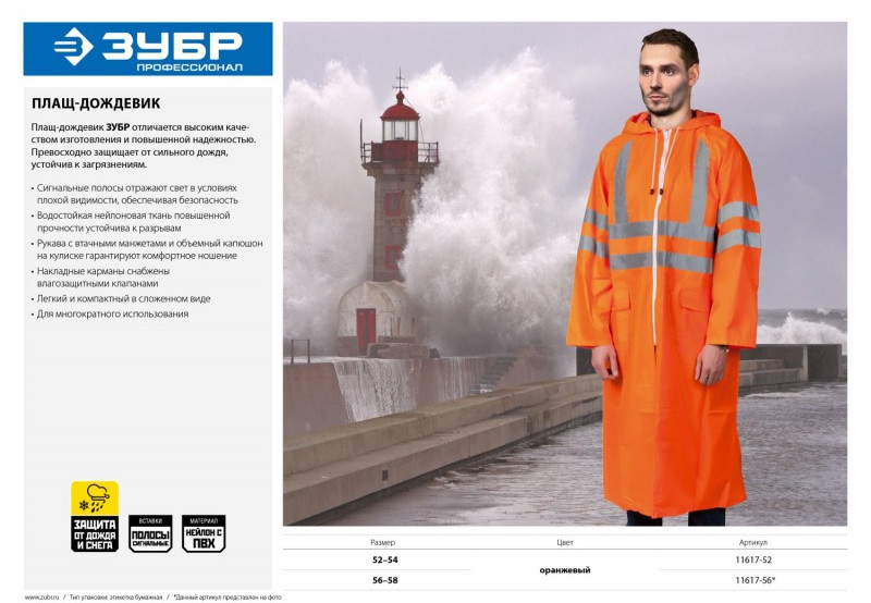 Плащ-дождевик ЗУБР отличается высоким качеством изготовления и повышенной надежностью. Превосходно защищает от сильного дождя, устойчив к загрязнениям и разрывам.