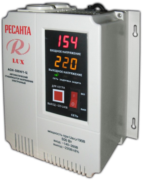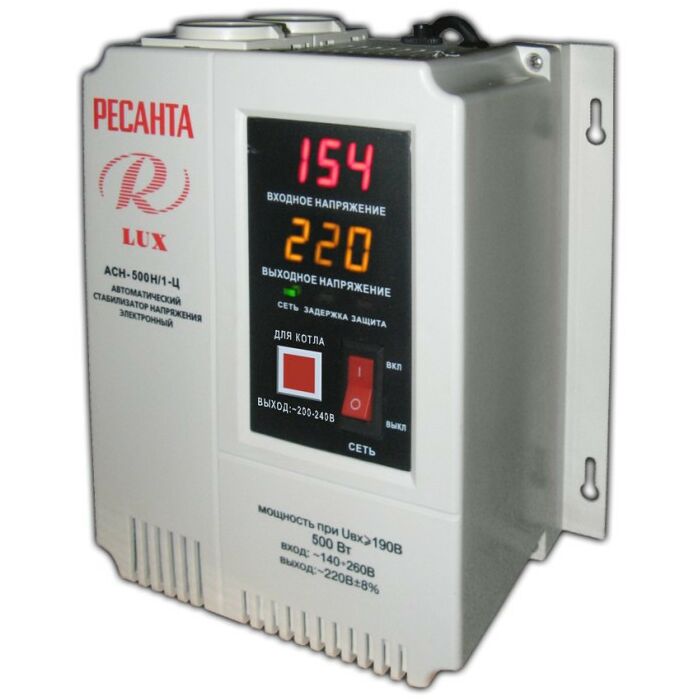 - Стабилизатор серии LUX РЕСАНТА АСН-500 Н/1-Ц - однофазный релейный стабилизатор для размещения на стене. Устройство выравнивает входящее напряжение и защищает электрические приборы от высоких скачков напряжения с суммарной мощностью до 0.5 кВт. Благодаря металлическому корпусу внутренние узлы защищены от механических повреждений. Стабилизатор Ресанта оснащен цифровым дисплеем, показывающим основные параметры работы. Для более эффективного охлаждения в конструкции прибора предусмотрен вентилятор. С помощью функции «Байпас» можно выключить устройство и подключить нагрузку в обход стабилизатора к питающей сети одним нажатием кнопки.
