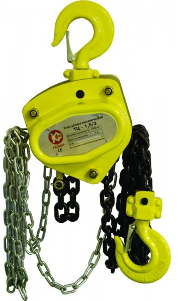 Таль цепная Калибр ТЦ1,5/3 с длиной цепи 8 метра. Грузоподъемность может достигать 1,5 тонны.