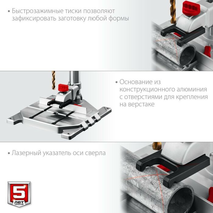 - Профессиональный сверлильный станок для точных работ. Быстрое и качественное сверление отверстий в различных материалах (при установке соответствующих типов сверл). Электронный дисплей позволяет считывать информацию о текущей скорости и глубине сверления во время эксплуатации. Быстрозажимное устройство позволяет надежно фиксировать даже круглые заготовки, обеспечивая высокую точность выполняемых отверстий. Лазерный указатель точно указывает точку вхождения сверла в материал, обеспечивая быстрое получение точного результата. LED подсветка рабочей зоны. Двухступенчатый редуктор позволяет подобрать оптимальные режимы для обрабатываемого материала.