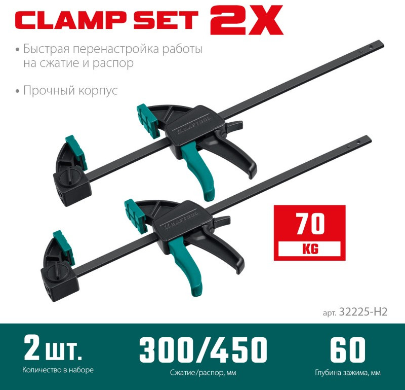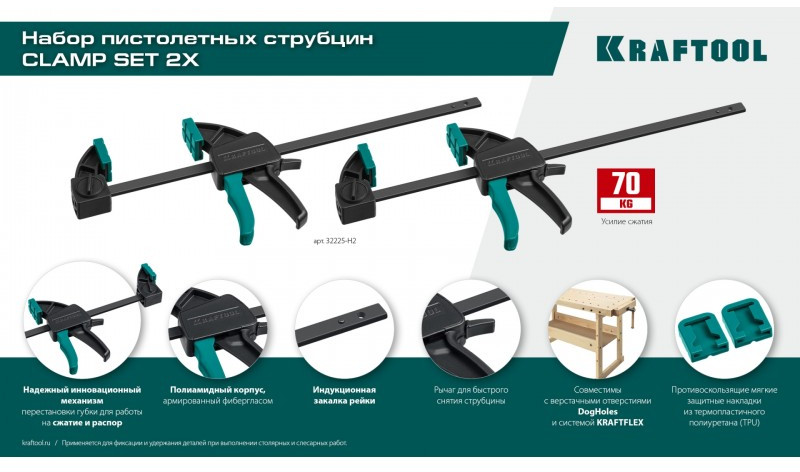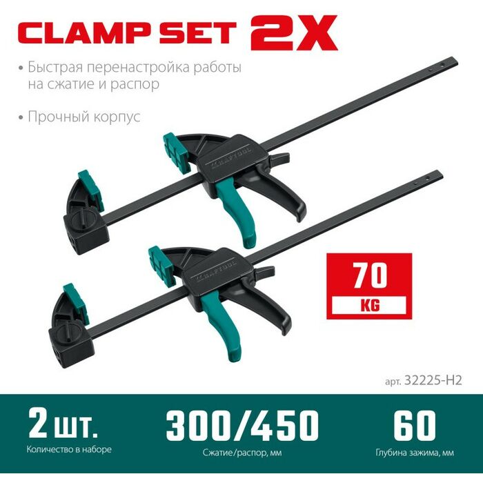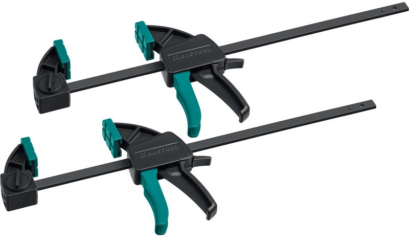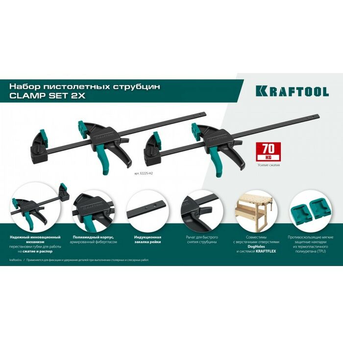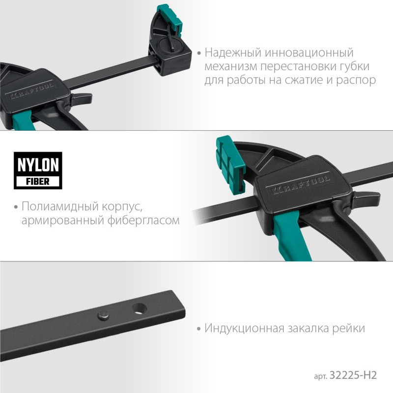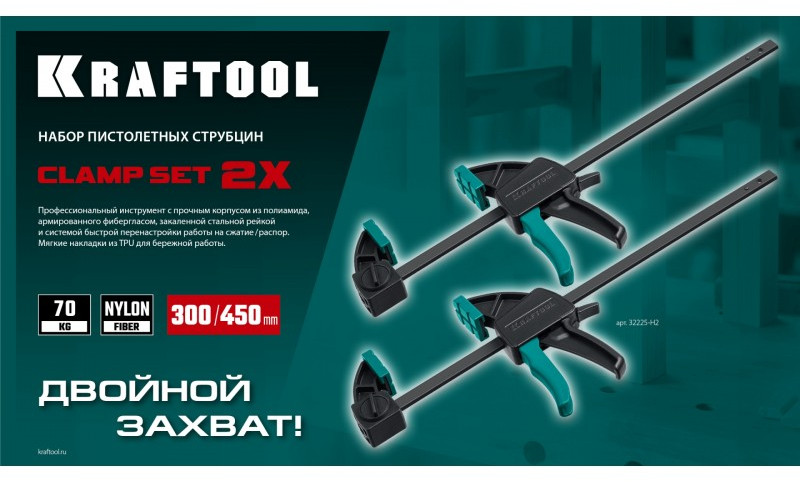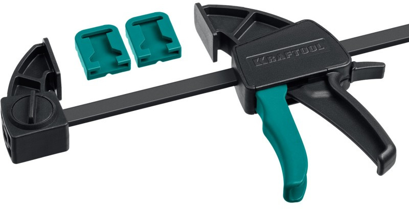 Профессиональный набор быстрозажимных пистолетных струбцин KRAFTOOL 2X для широкого спектра работ. Прочный армированный фиберглассом корпус и закалённая рейка позволяют зажимать заготовки с усилием 700 Н. Работа на сжатие и в распор. Бережная работа с деликатными материалами благодаря мягким сменным накладкам из TPU.