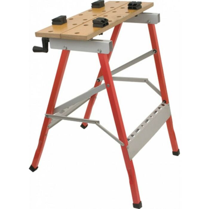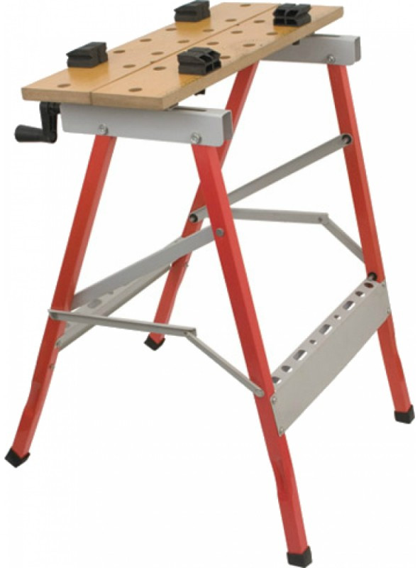 Верстак имеет складную конструкцию, что облегчает хранение и транспортировку;УстойчивостьСтолешница выполнена из МДФМеталлические ножки выдерживают большую нагрузкуРаздвижная столешница дает возможность удобной работы с деталями шириной до 23.5 см.Max нагрузка на стол, кг: 100Габариты без упаковки, мм: ширина 235Ширина рабочего стола, мм: 235Основной цвет: красныйСкладной: даТиски: есть