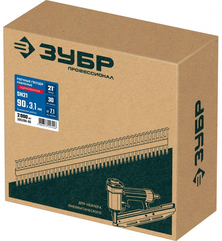 Монтаж производится при помощи гвоздезабивного пистолета (нейлера) ЗУБР SN34-90 (арт. 31924), ЗУБР SN34-90A (арт. 31925) или аналогичного, рассчитанного на работу с гвоздями в кассетах с углом наклона 34 град.
