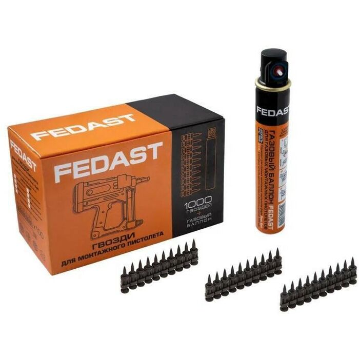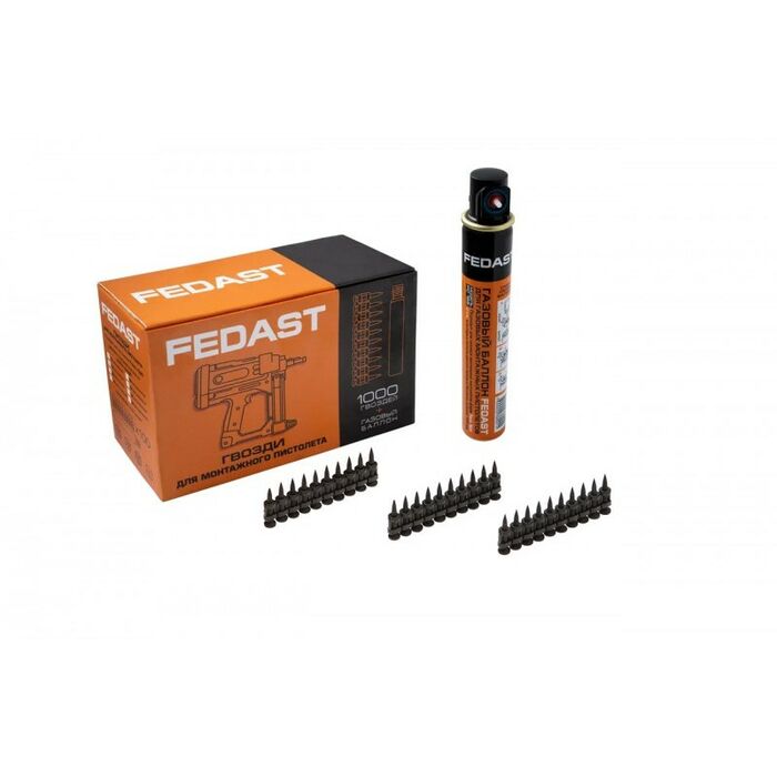Гвозди поставляются в комплекте с газовым баллоном FEDAST 165 мм, совместимым с большинством производителей газовых монтажных пистолетов.