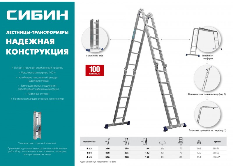 - Лестницы СИБИН предназначена для выполнения различных хозяйственных работ. Надежная конструкция в сочетании с высококачественными материалами обеспечивают легкость и удобство в эксплуатации.