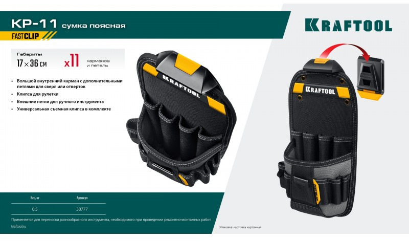 Профессиональные пояса и сумки KRAFTOOL KRAFTBUILT с системой быстросъёмного крепежа предлагают уникальную возможность организации рабочего процесса. Используйте только только тот инструмент, который нужен именно сейчас.