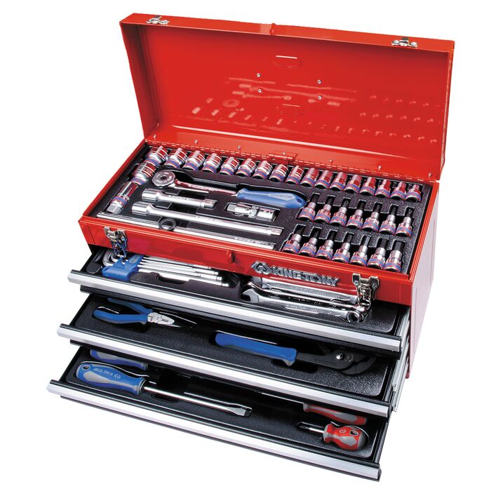 Инструментальный ящик выдвижного типа прекрасно подойдёт как для стационарного использования, так и для мобильного варианта. Здесь – набор самых востребованных инструментов, которыми можно выполнить большинство видов слесарно-монтажных работ, а удобное размещение в подложках выдвижных полок поможет всё держать в полном порядке.