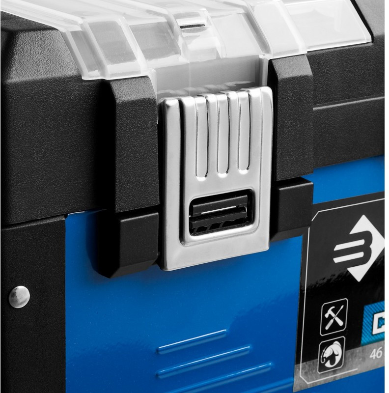 Прочный металлический ящик позволяет организовать удобное и надежное хранение большого количества инструментов. Широкая алюминиевая рукоятка помогает сместить центр тяжести ящика, если это необходимо