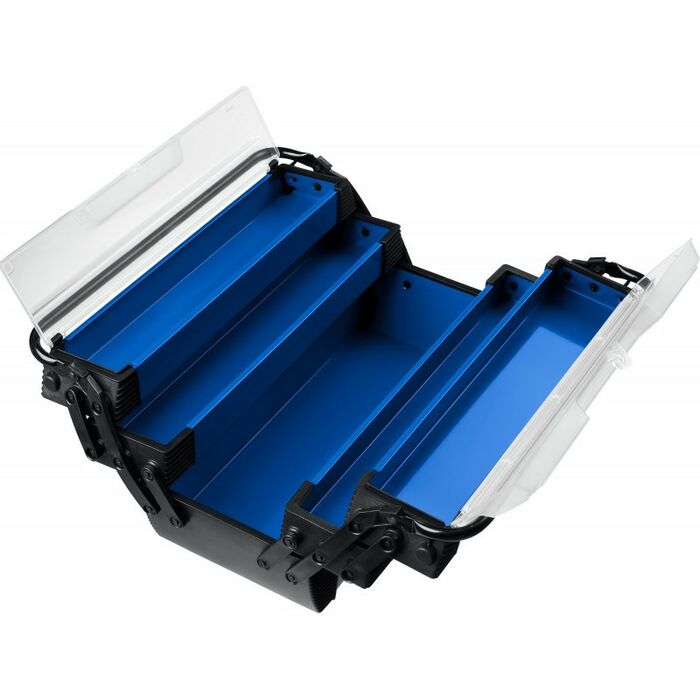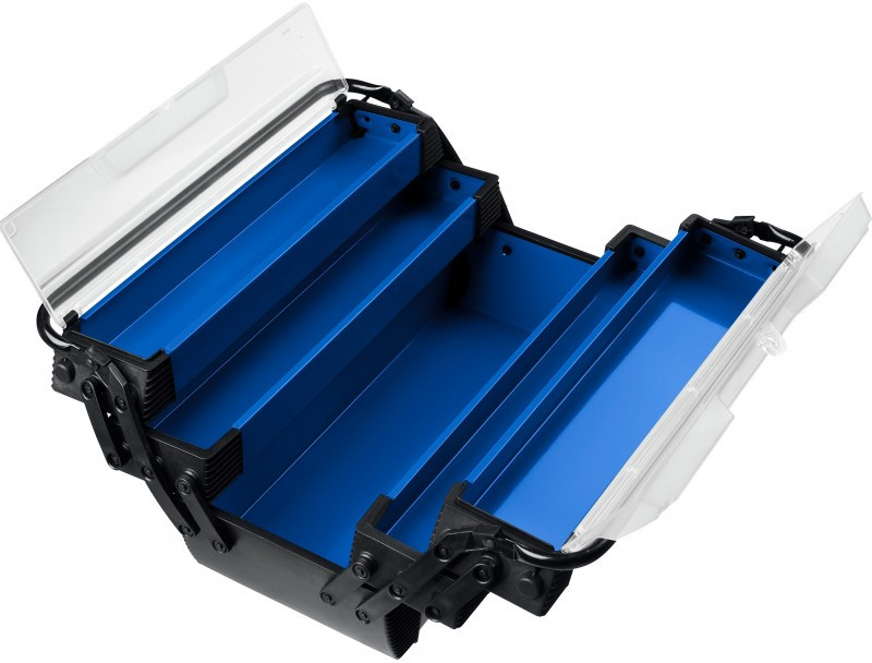 Ящик с раздвижными полками позволяет организовать удобное удобное хранение инструмента и доступ к нему. Широкая ручка помогает сместить центр тяжести ящика, что обеспечивает удобство и комфорт переноски