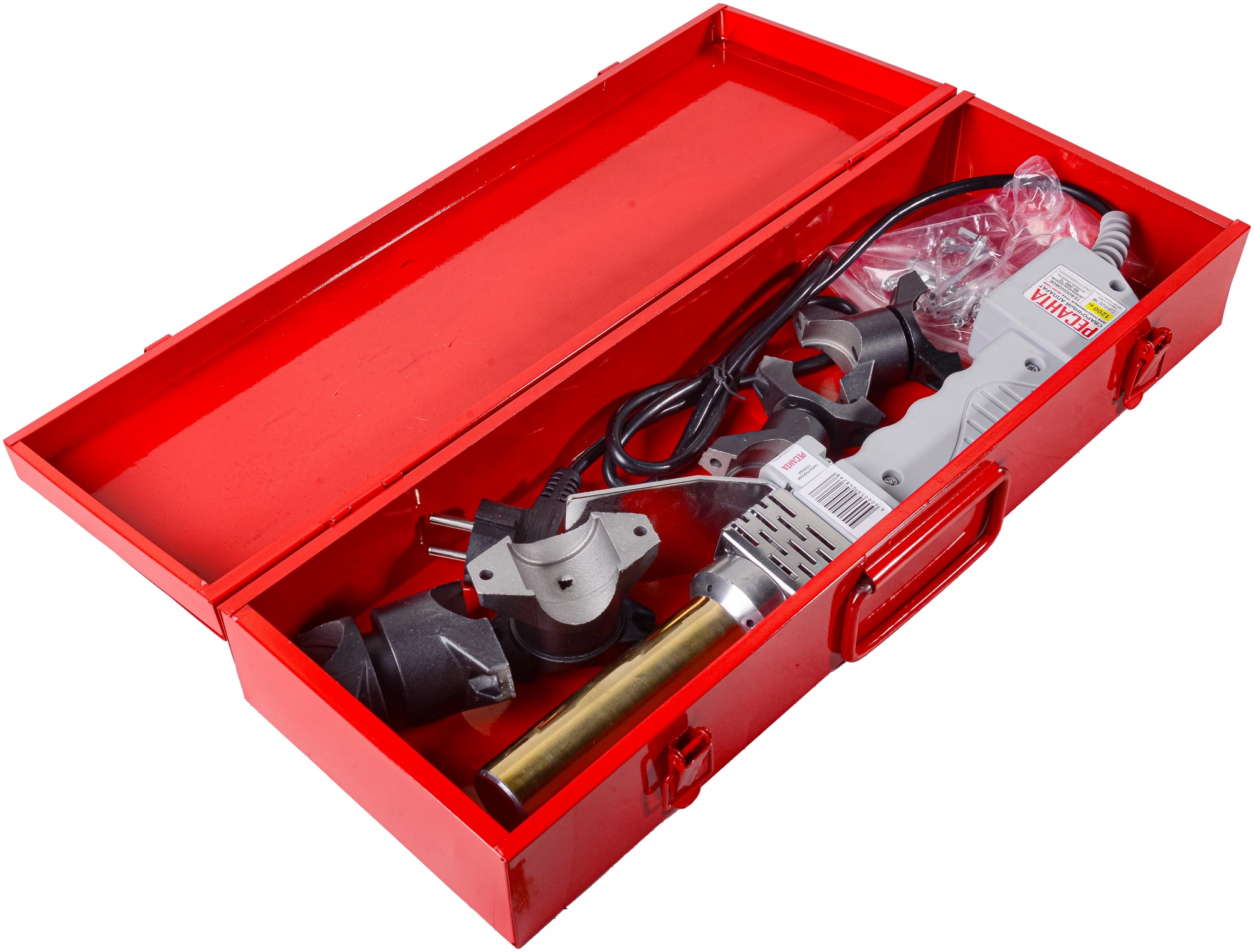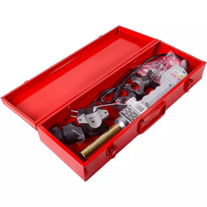 | Комплектация | Паяльник для труб, насадки (диаметр 16, 20, 25, 32) - 4 шт.; ключ имбусовый - 2 шт.; Болт/гайка — 4 шт./4 шт.; кейс; руководство по эксплуатации. |