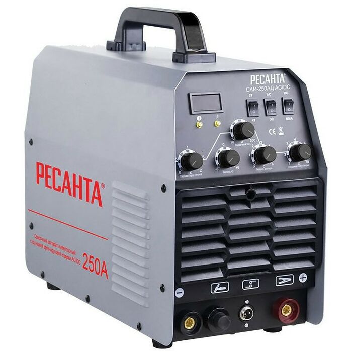 - Сварочный аппарат РЕСАНТА САИ-250АД AC/DC - современная инверторная аргонодуговая установка, позволяющая работать как на постоянном (сварка черных и нержавеющих сталей, меди, титана и пр.), так и на переменном токе (сплавы алюминия, магния, медные сплавы больших толщин и пр.), где требуется удаление окислов со свариваемой поверхности в режиме TIG, а также возможна сварка ММА покрытым электродом (рутиловым и основным покрытием)